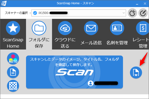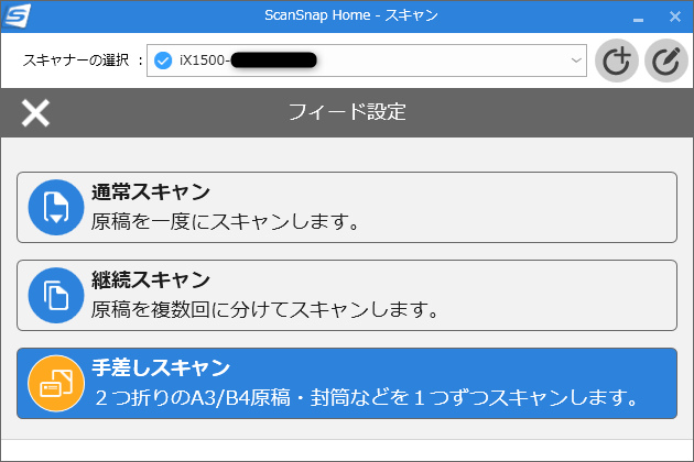 - ScanSnap Homeのスキャン画面で、右側のボタン(フィード設定)を押します。